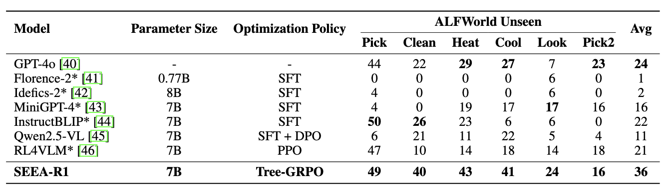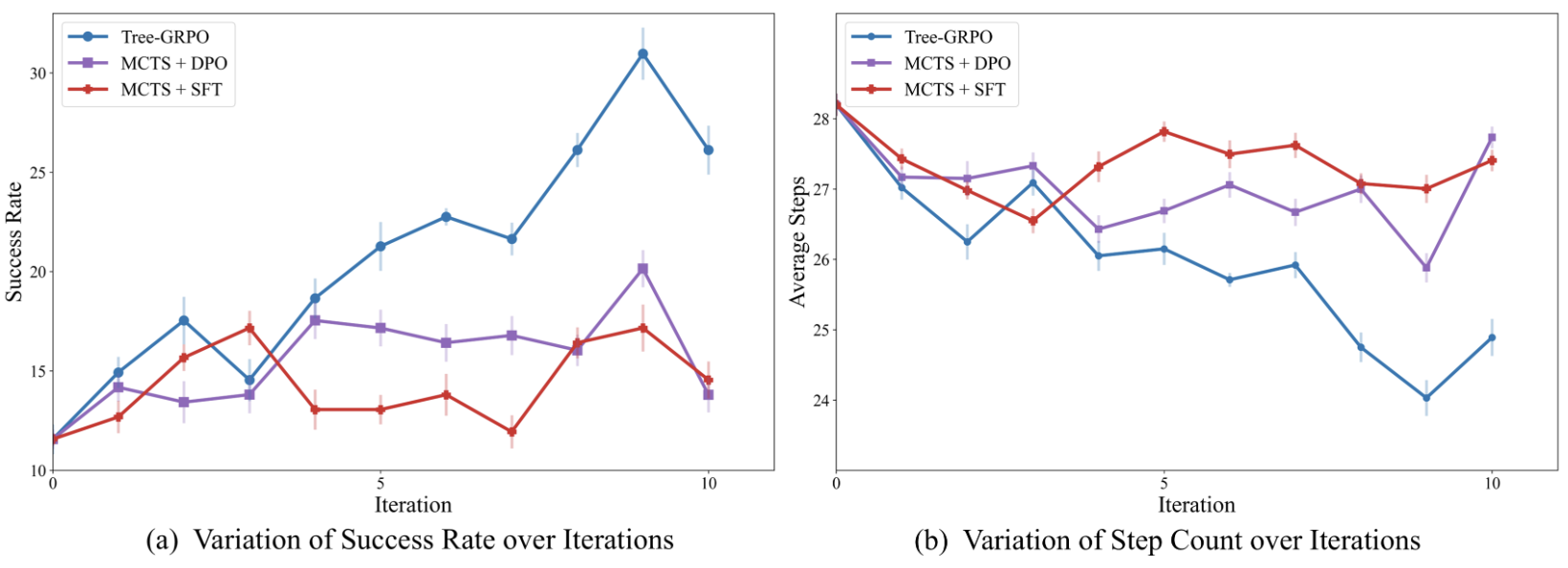 Performance comparison of SEEA-R1 using different optimization algorithms on ALFWorld over training iterations.