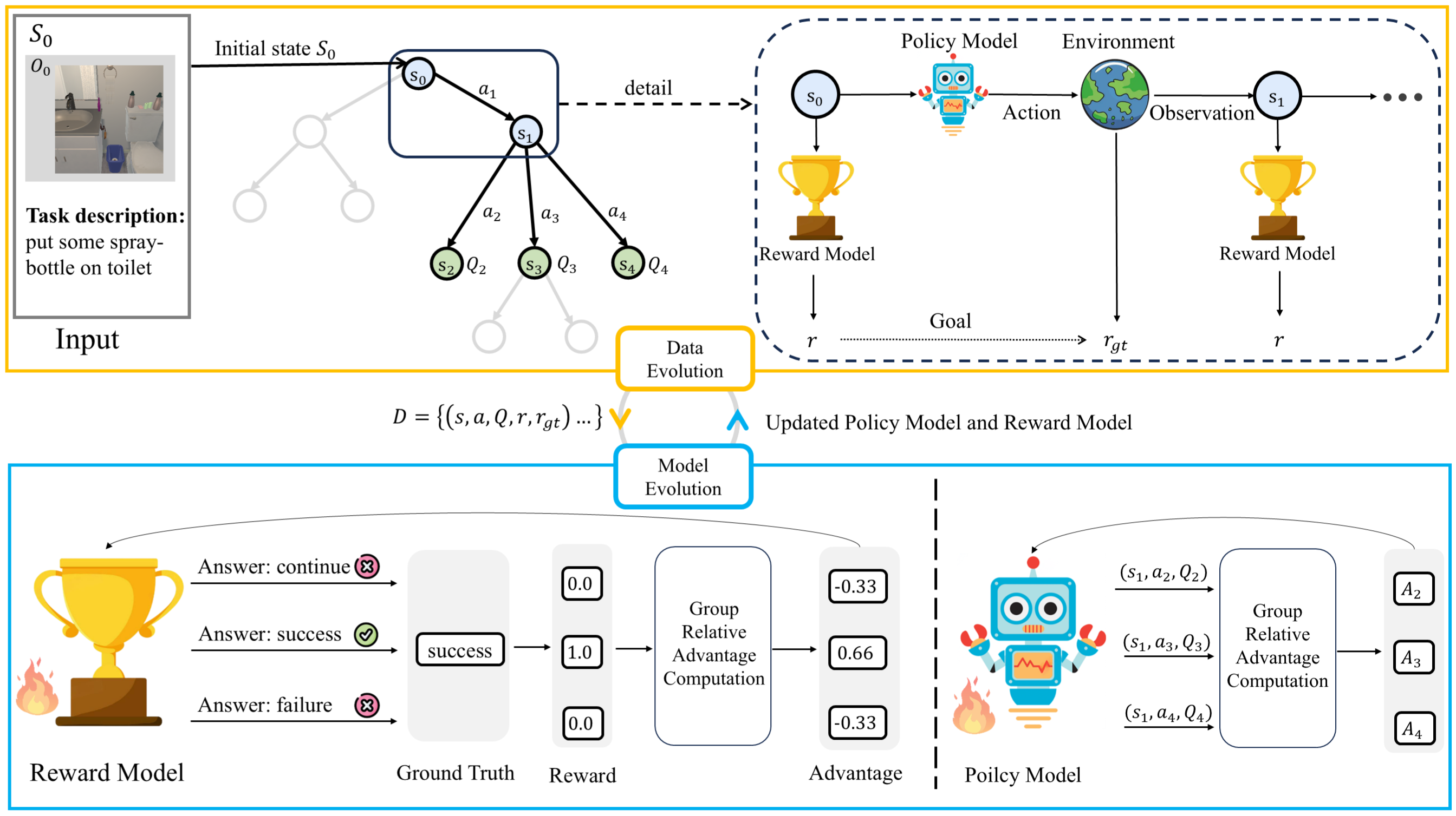 The framework drives continuous improvement through an iterative loop of two core cycles as follows: 1. Data Evolution: The Policy Model interacts with the environment via MCTS from an initial state to generate the experience dataset, containing trajectories with derived Q-values, ground truth rewards from the environment, and rewards from the current Reward Model. 2. Model Evolution: The collected data is used to update both models: (a) The Policy Model to predict actions and (b) The Reward Model to predict categorical outcomes. Refined models from Model Evolution then drive the next Data Evolution iteration, enabling continuous self-evolution.