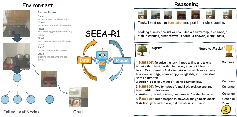 Self-evolution, the ability of agents to autonomously improve their reasoning and behavior, is essential for the embodied domain with long-horizon, real-world tasks. Despite current advancements in reinforcement fine-tuning (RFT) showing strong performance in enhancing reasoning in LLMs, its potential to enable self-evolving embodied intelligence with multi-modal interactions remains largely unexplored. Specifically, reinforcement fine-tuning faces two fundamental obstacles in embodied settings: (i) the lack of accessible intermediate rewards in multi-step reasoning tasks limits effective learning signals, and (ii) reliance on hand-crafted reward functions restricts generalization to novel tasks and environments. To address these challenges, we present Self-Evolving Embodied Agents-R1, SEEA-R1, the first RFT framework designed for enabling the self-evolving capabilities of embodied agents. Specifically, to convert sparse delayed rewards into denser intermediate signals that improve multi-step reasoning, we propose Tree-based group relative policy optimization (Tree-GRPO) integrates Monte Carlo Tree Search into GRPO. To generalize reward estimation across tasks and scenes, supporting autonomous adaptation and reward-driven self-evolution, we further introduce Multi-modal Generative Reward Model (MGRM). To holistically evaluate the effectiveness of SEEA-R1, we evaluate on the ALFWorld benchmark, surpassing state-of-the-art methods with scores of 85.07% (textual) and 36.19% (multi-modal), outperforming prior models including GPT-4o. SEEA-R1 also achieves scores of 80.3% without environmental reward, surpassing all open-source baselines and highlighting its scalability as a self-evolving embodied agent. Additional experiments and qualitative analysis further support the potential of SEEA-R1 for future research in scalable embodied intelligence.
